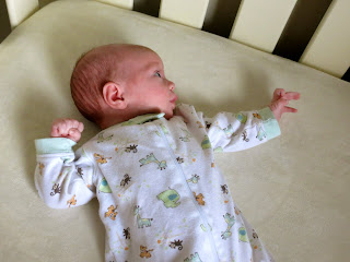 Sam is eating like a pig and sleeping like an angel. I have refrained from blogging about his amazing sleeping habits for fear that it will end. He has been sleeping for at least 7 hours for over 10 days now. Last night he went to sleep at 9:30, and Spencer had to wake him at 7AM. I couldn't believe it! I brace myself each morning when I first look at the clock when I hear him stirring. I am not sure if it's 2AM or 7AM. So far he is waking between 6 and 7AM. He is not much of a napper during the day, but I will take it! I can do anything with a full night's sleep.