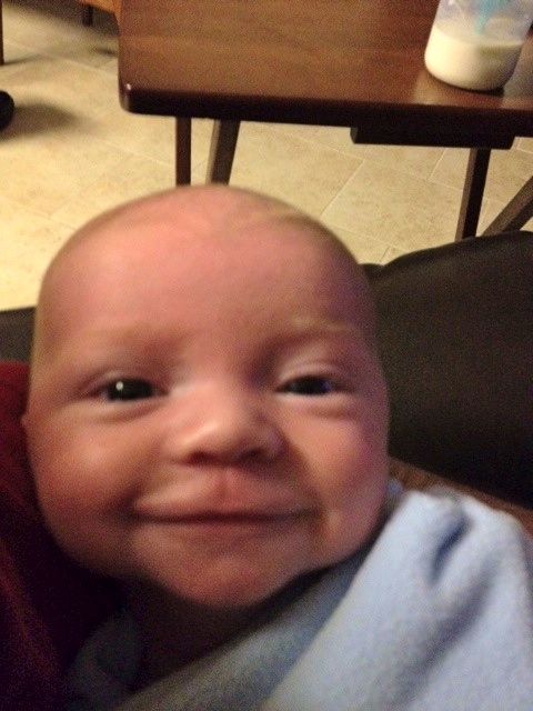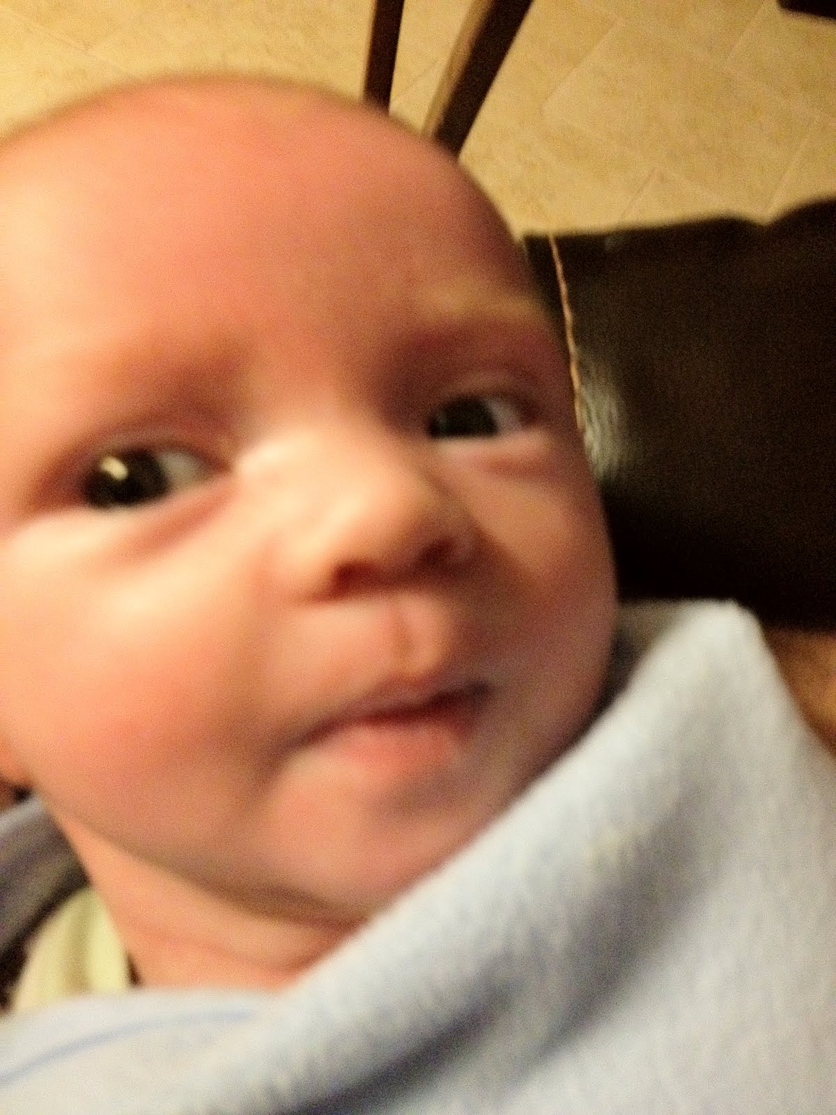 Spencer is always taking pictures of Sam during his morning feedings. Sometimes Sam's face looks a little distorted because the camera is too close, but these pictures are special. Spencer must really talk to him because he gets him to smile and laugh a lot.