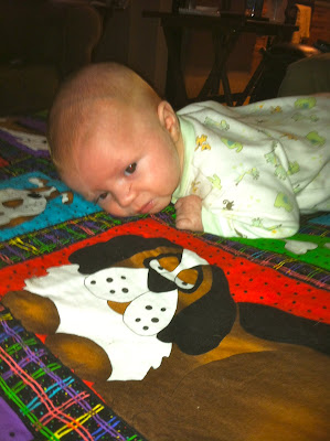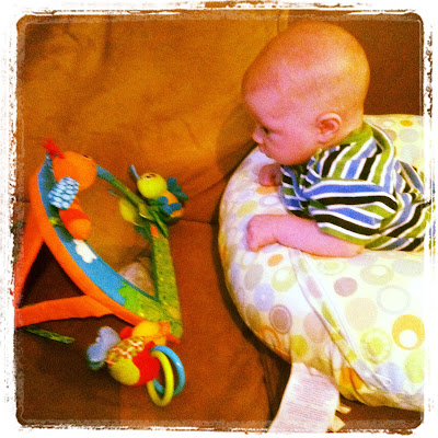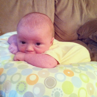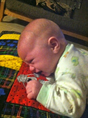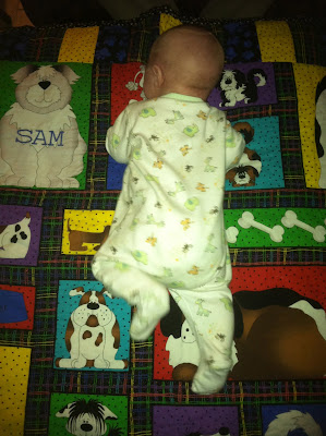 Placing Sam on his stomach is torture for him and me. Millions of babies have learned to crawl without 30 minutes of "tummy time" that everyone talks about now, and I know Sam will too. I just don't think his muscles are developed yet to support his XXL head yet. I am going to be patient with him.