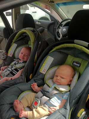 Luckily the two car seats fit in the back of my car. Sam looks like he is up to something.